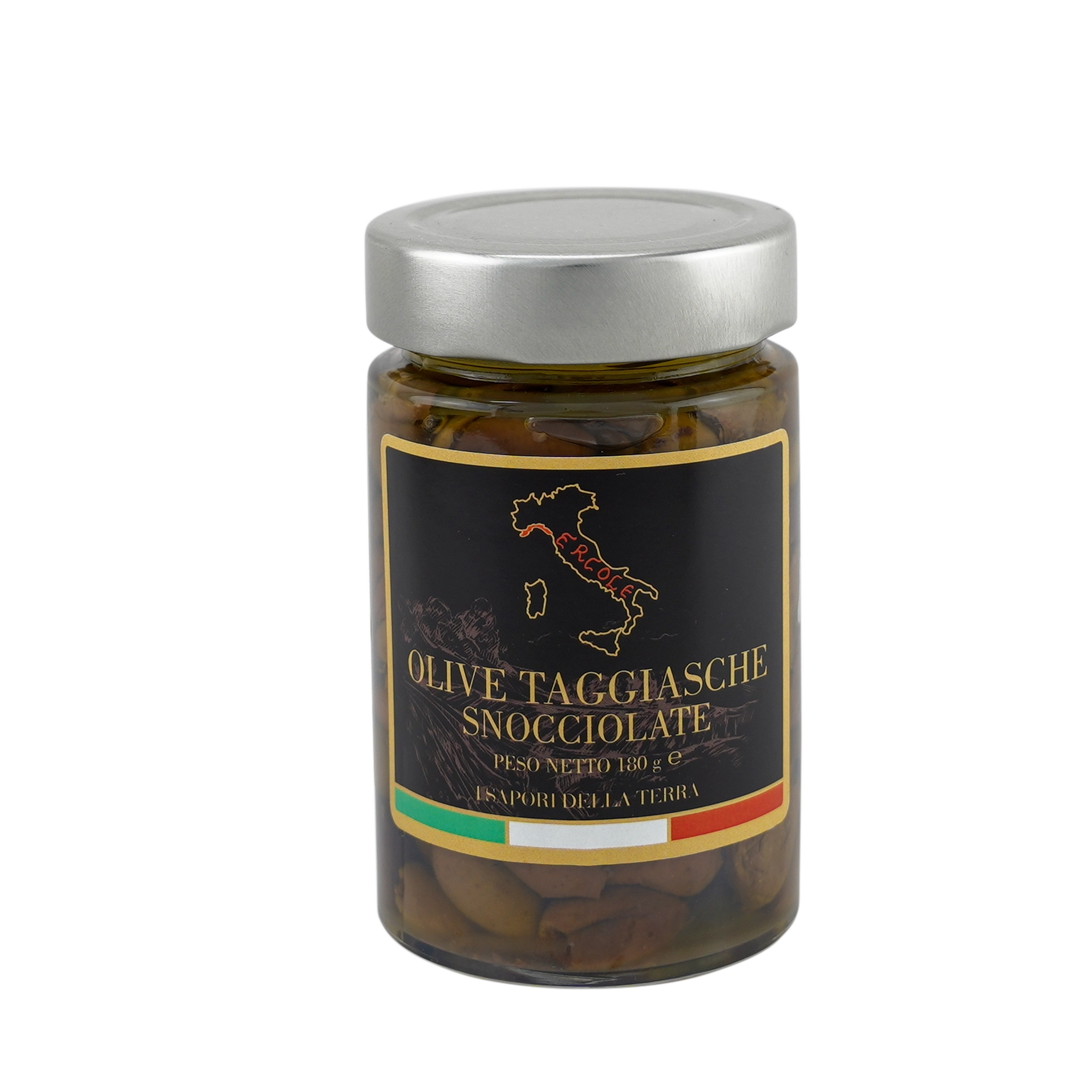 Las aceitunas taggiasche sin pepa son pequeñas y tienen un sabor inconfundible. Obtenidas deshuesando aceitunas en salmuera y conservándolas después en aceite de oliva extra virgen. Son perfectas consumidas al natural como aperitivo o como un sabroso ingrediente de salsas, ensaladas y platos de carne o pescado.